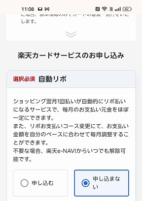 楽天IDだの住所入力、免許書番号入力などをやっていくと自動リボの選択画面があります。そのままでは申し込むになっていますので必ず申し込まないにチェックをいれてください。 コワイ・・コワイ・・こういうよく読まない人を騙すやり方嫌いです。