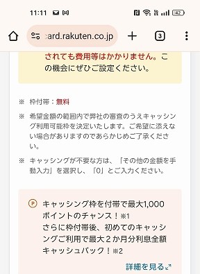 また少し進むとキャッシング枠を決めてくださいという項目があり30万、20万円、10万円しか選択肢がないように見えます。それなのにキャッシング枠付帯で最大1,000ポイント?おかしいですよね・・
