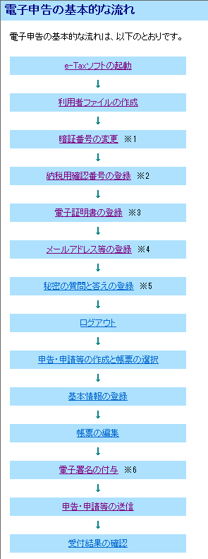 ようやくe-taxソフトがインストールできて起動したと思ったらまだまだする事があります。起動してすぐ右上の「基本的な流れ」を確認すればでてきますが・・