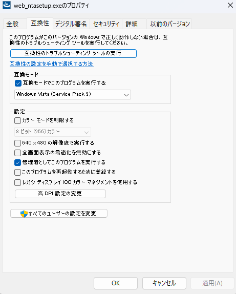 ここまでできたら一つ上に戻って…「e-Taxのインストールその前に」を参考にセキュリティソフトを一時的にオフにし互換モードで再実行してください。