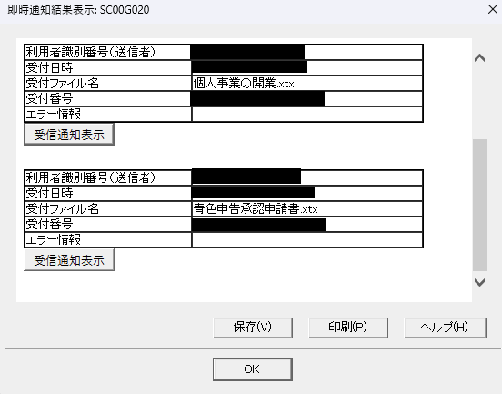 無事に送信できると通知結果が見れますので印刷するか保存しておきます。