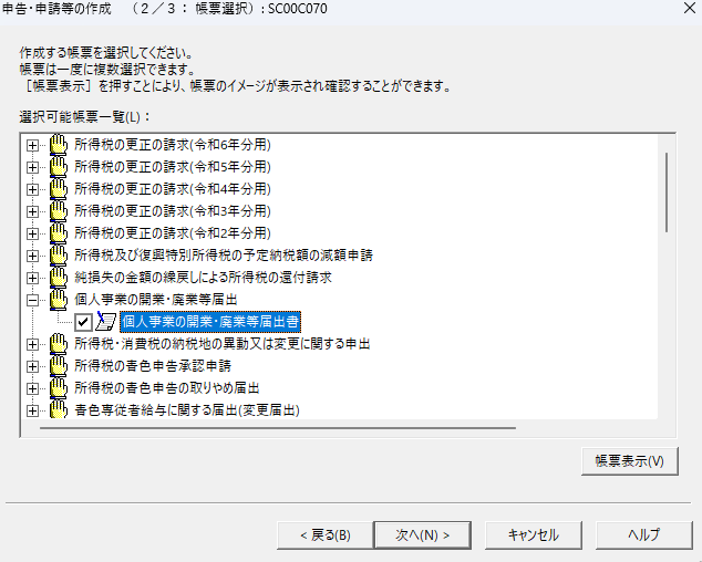 個人事業の開業・廃業届出書という項目がでてくるはずなのですが初期の段階でこれがありません・・