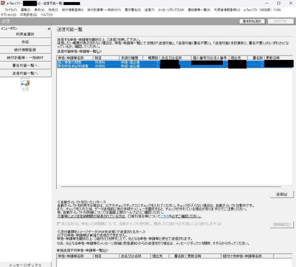 保存した状態で送信可能一覧に2つが表示されます。表示されない場合は電子証明書の登録が終わっていないとかICカードリーダーが準備できる状態にないかです。