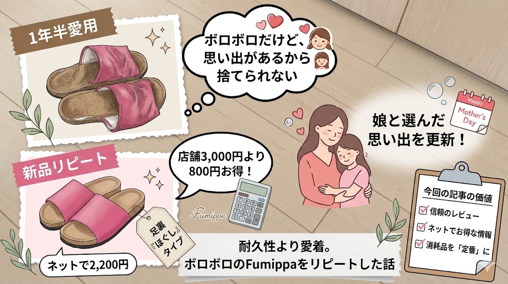 でも、わが家にとってFumippaは単なるスリッパではなく、「娘と選んだ思い出」であり「妻の足を癒やす定番品」になりました。