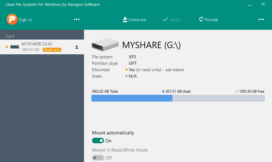 Paragon Linux File Systems for Windows でも、XFS は 基本的に読み取り専用でWindows ネイティブで XFS を 安全に書き込み可能 にする方法は 事実上ない事が判明