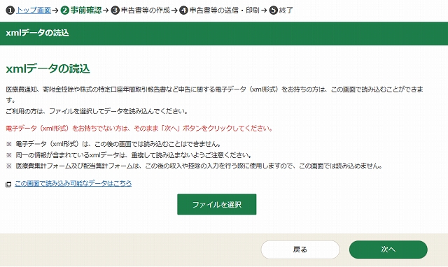 xml(エクセルデータ)で電子データを持っている人はファイルを選択。私の場合は持っていないのでそのまま次へ・・