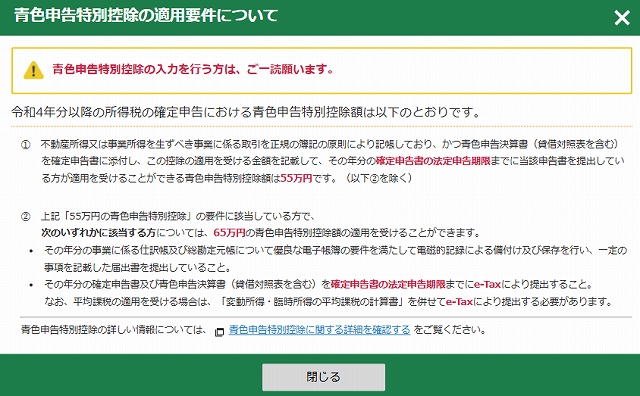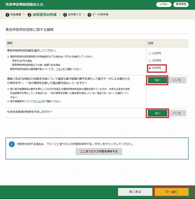 青色申告で65万円の控除を受けるので65万円にチェック。