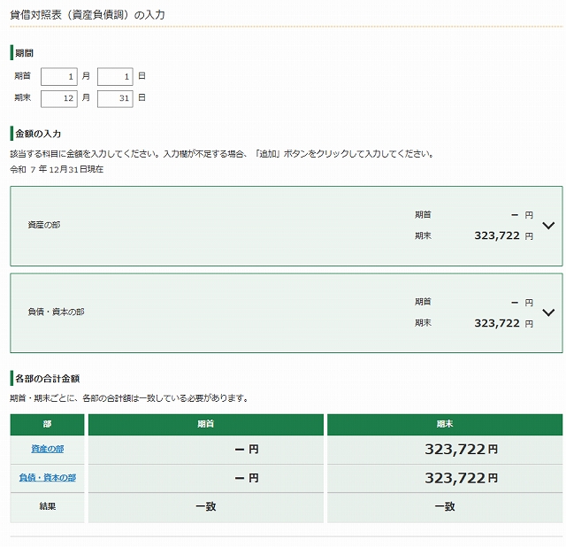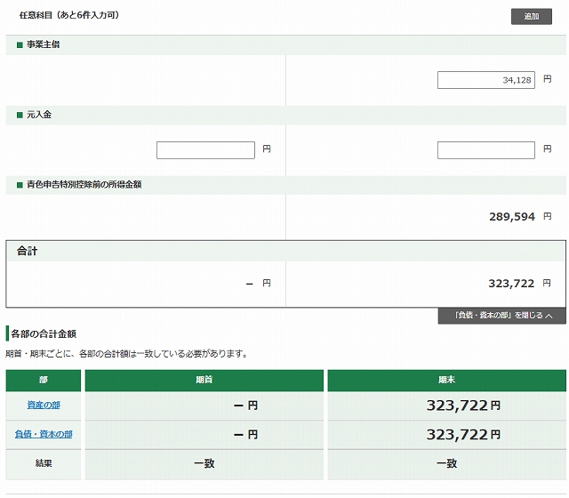 資産、負債の金額が一致したら次へ進みます