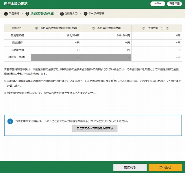 ここまでの状況は、「青色申告決算書(収支の結果)」の入力が終わっただけで、「確定申告書(税金を計算する書類)」の作成がまだ始まっていない状態です。