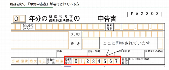 整理番号は、1月くらいに税務署から送られてくる「確定申告書」の中に書いてあります。
