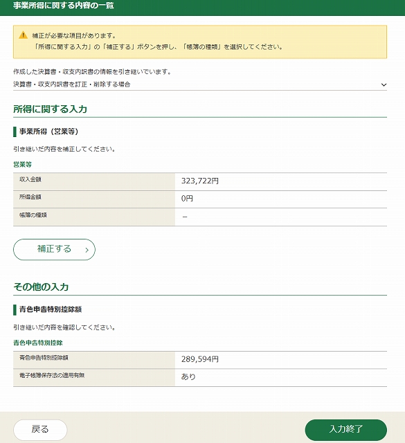 ※補正するを選択し、帳簿の種類に「複式簿記に従って記帳」を選択してください