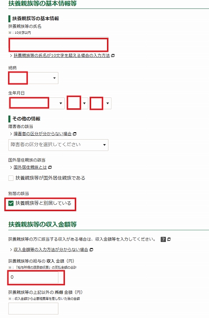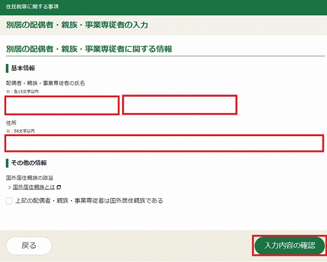 別居の配偶者・親族・事業専従者がいる場合にチェックを入れて入力します