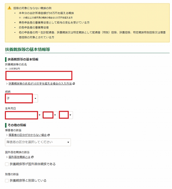 ■息子が16歳以上(大学生)なので次の項目を入力します。